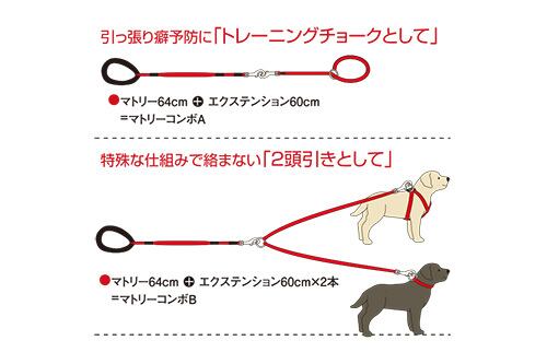 エクステンションはリードに付け足して延長したり、トレーニングチョークや仮の係留にも使えて非常に便利。マトリーやモングリルネオに2本使うと絡まない2頭引きにもなります。反射機能付。
