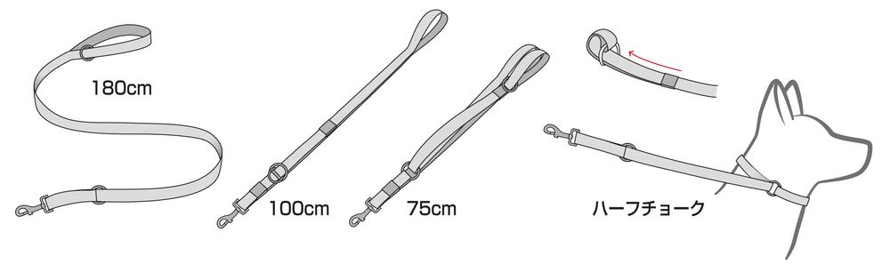 約180cm/100cm/75cmという3通りの長さを場面に応じて使い分け。一時的にハーフチョークとして係留ができるリードに。
