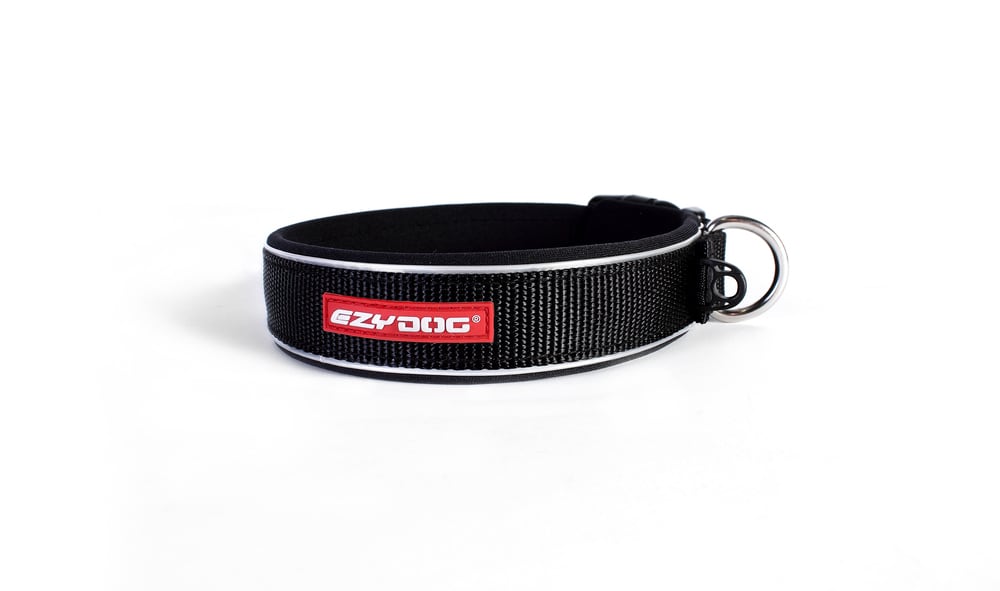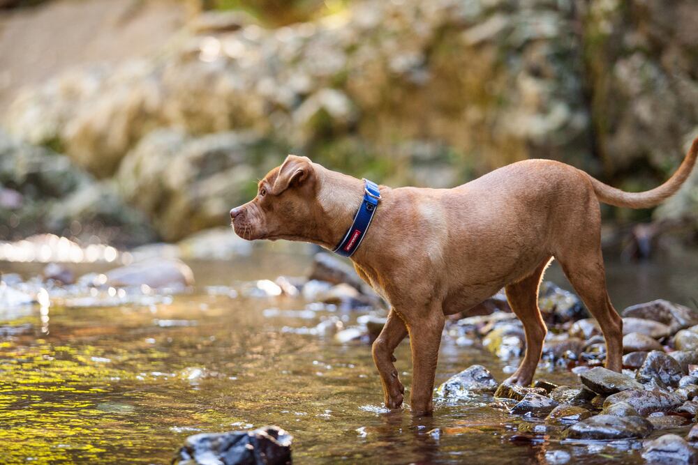 内側にウェットスーツ素材を使用しているので肌に優しく、軽くて丈夫、もちろん防水で汚れにくい首輪です。サイズの微調整が可能。迷子札などを取り付けるフック付。反射機能付。