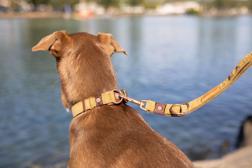 1つのバックルと2つのリングで二重ロック。ソフトな肌触りでありながら耐久性を持つ素材を使用、サイズ調整可能。