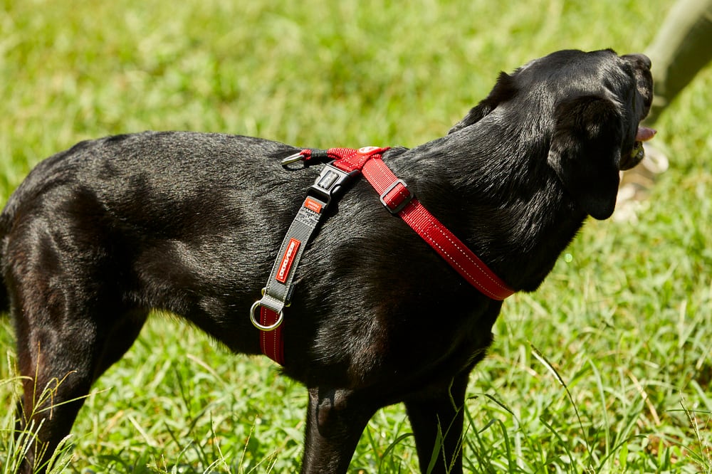 首から通して、わきの下でバックルを1箇所留めるだけで簡単に装着が可能です。愛犬が動いても体から外れにくいデザインです。