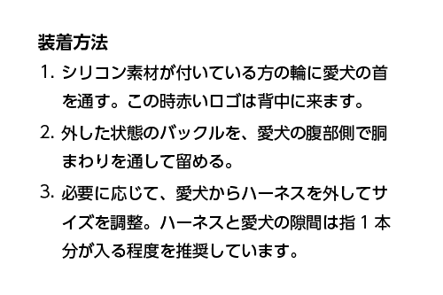 首から通して、わきの下でバックルを1箇所留めるだけで簡単に装着が可能です。愛犬が動いても体から外れにくいデザインです。