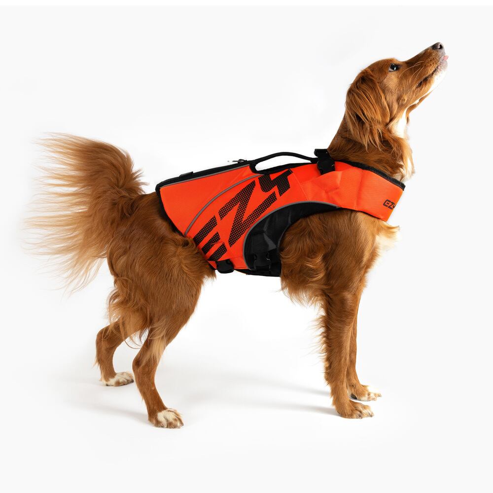 立体的なデザインで体にフィットし、可動域が広く泳ぎやすい。軽くて丈夫な犬用フローティングジャケット。