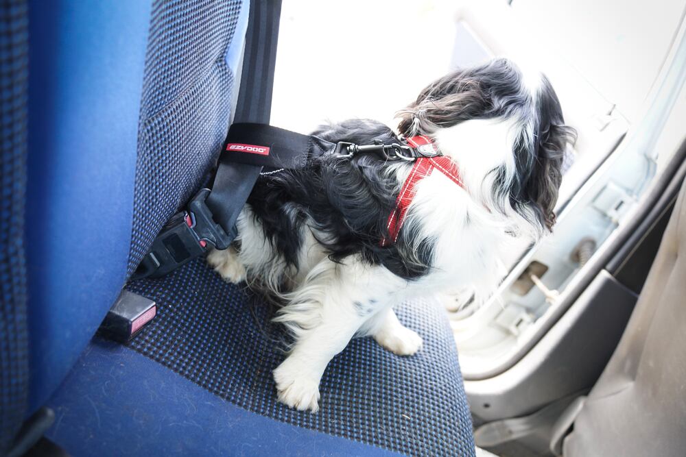 事故の際に前に飛び出して怪我することを防ぎます。車内で愛犬を固定しておかないと、運転の妨げとなり法律に違反する場合もあります。