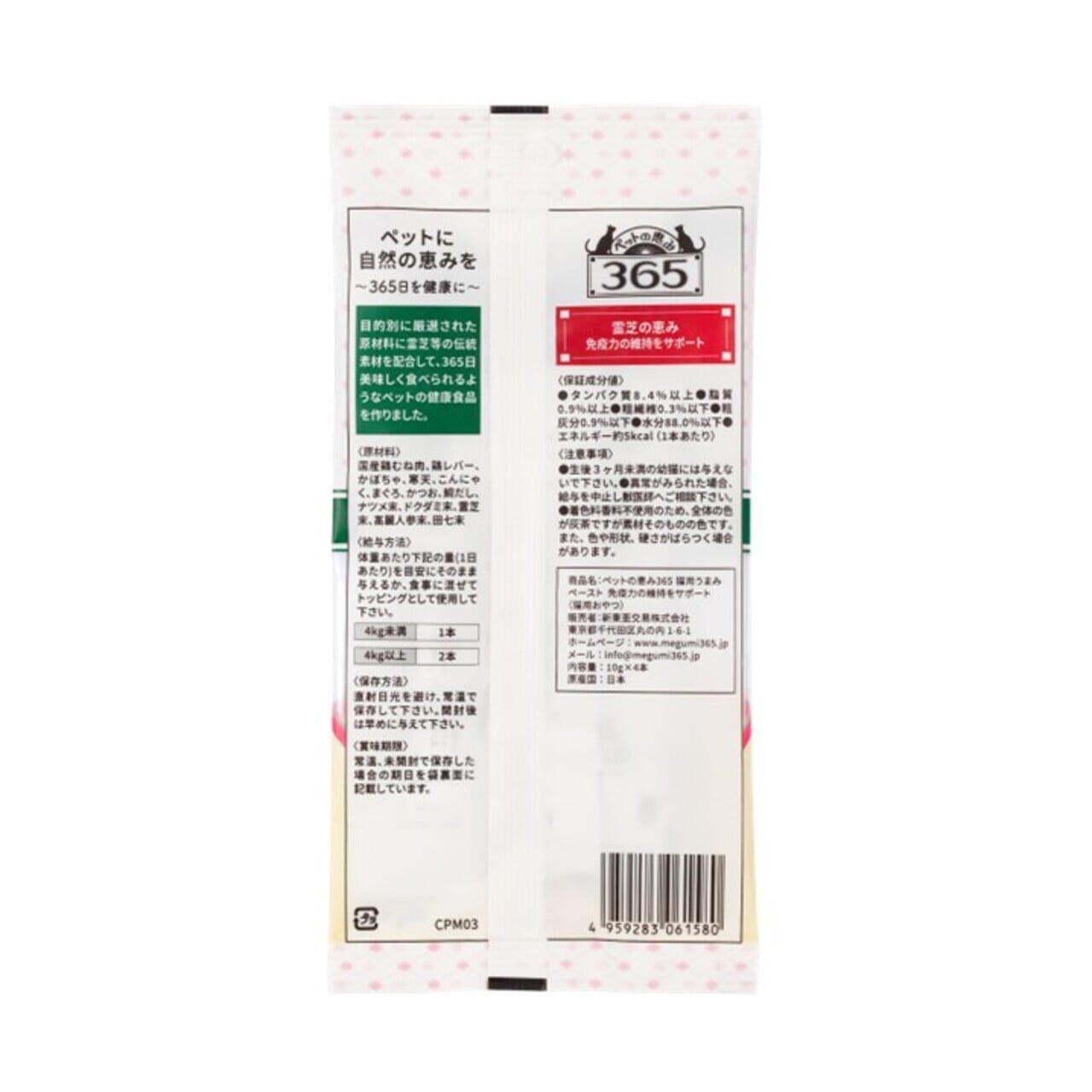 霊芝など希少な機能性素材と良質な国産鶏むね肉やまぐろ、かつおを配合した栄養バランスの良いペースト状のおやつです。ドライフードなどにかけても美味しく食べられます。