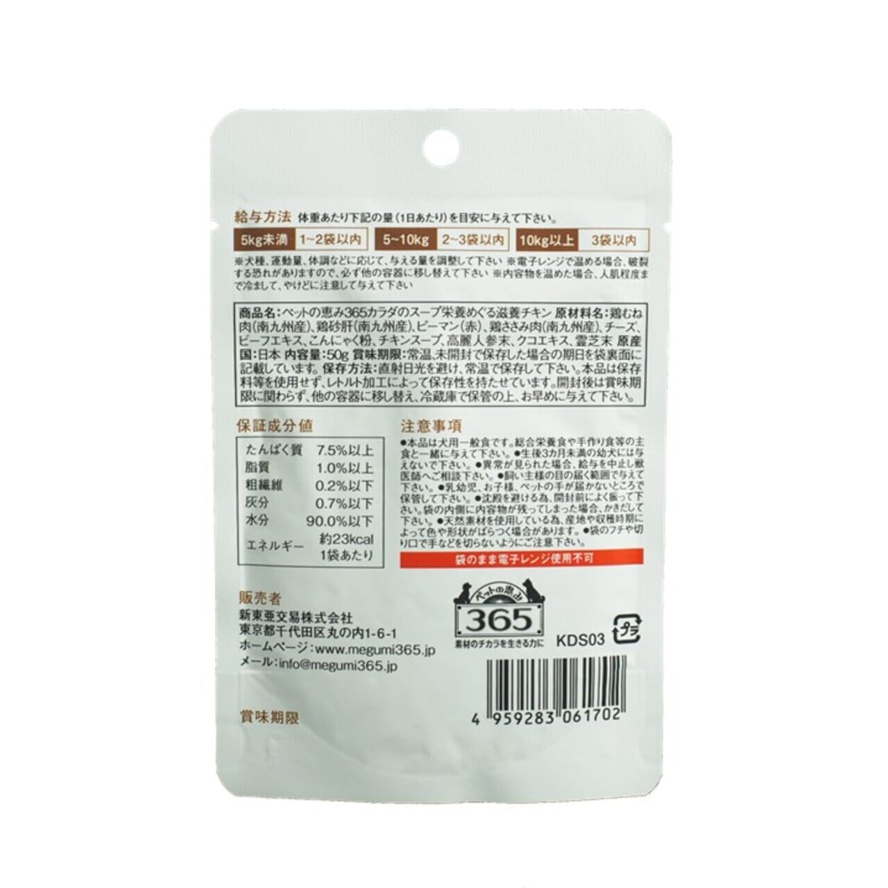 ※犬種、運動量、体調などに応じて、与える量を調整して下さい ※電子レンジで温める場合、破裂する恐れがありますので、必ず他の容器に移し替えて下さい ※内容物を温めた場合、人肌程度まで冷まして、やけどに注意して与えて下さい